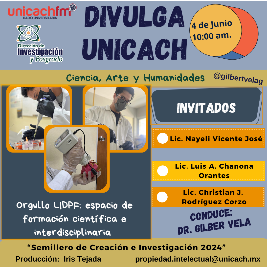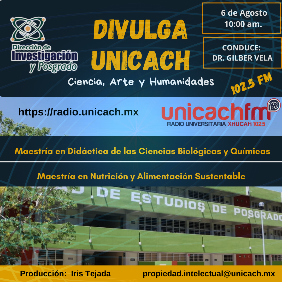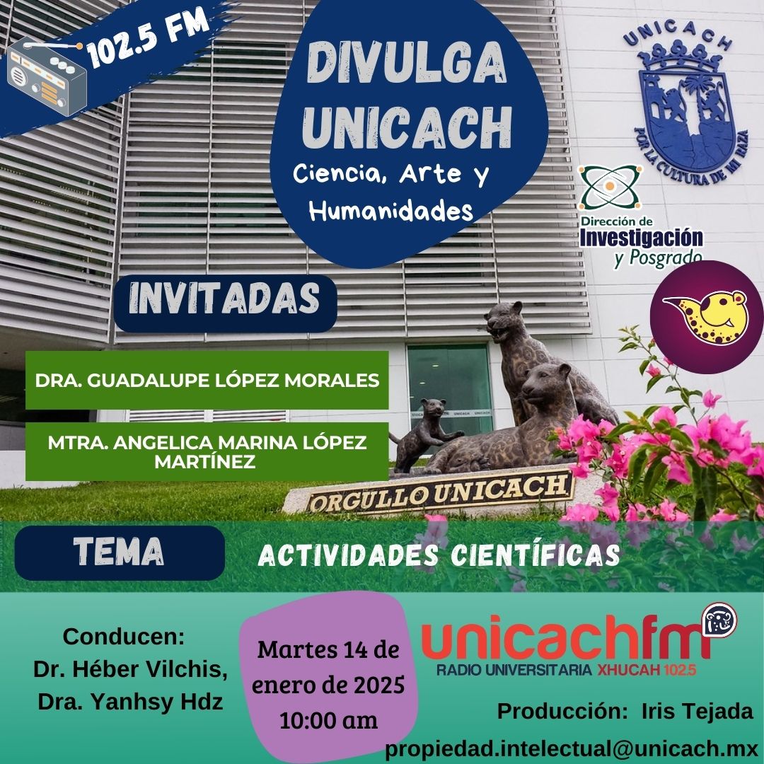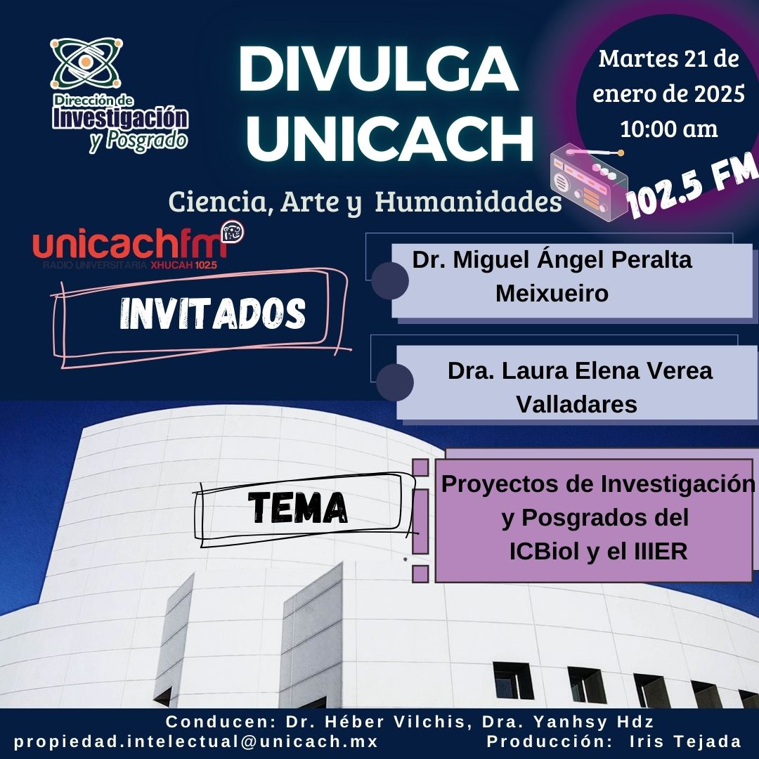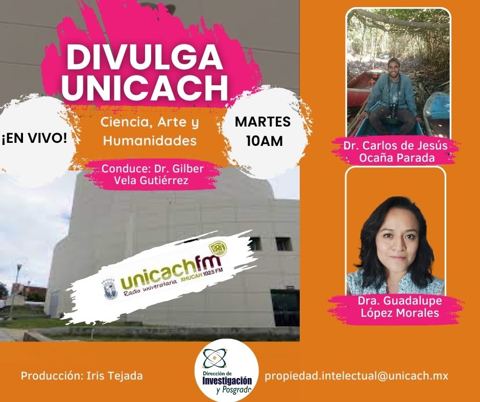 La nueva programación de DIVULGA UNICACH, tiene como finalidad dar difusión al trabajo científico y tecnológico de los investigadores, mediante coberturas en vivo en los laboratorios y espacios de formación de nuestra casa de estudio, donde se entrevistará a las y los investigadores encargados de estas áreas, tendremos la oportunidad de platicar sobre las actividades de investigación, creación e innovación que realizan acompañados de los estudiantes en formación, así como, el propósito del laboratorio y el equipamiento con el que cuenta para brindar el servicio a la comunidad universitaria. Además, nos comentarán sobre las actividades que realizan con personal externo a nuestra universidad.