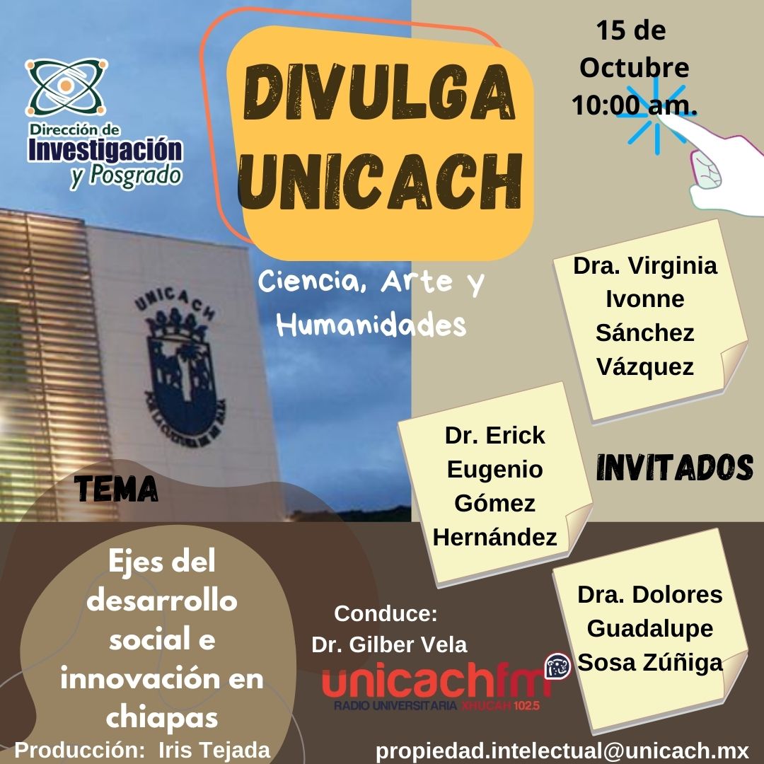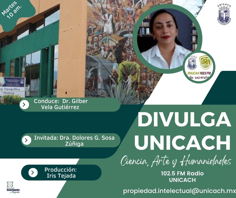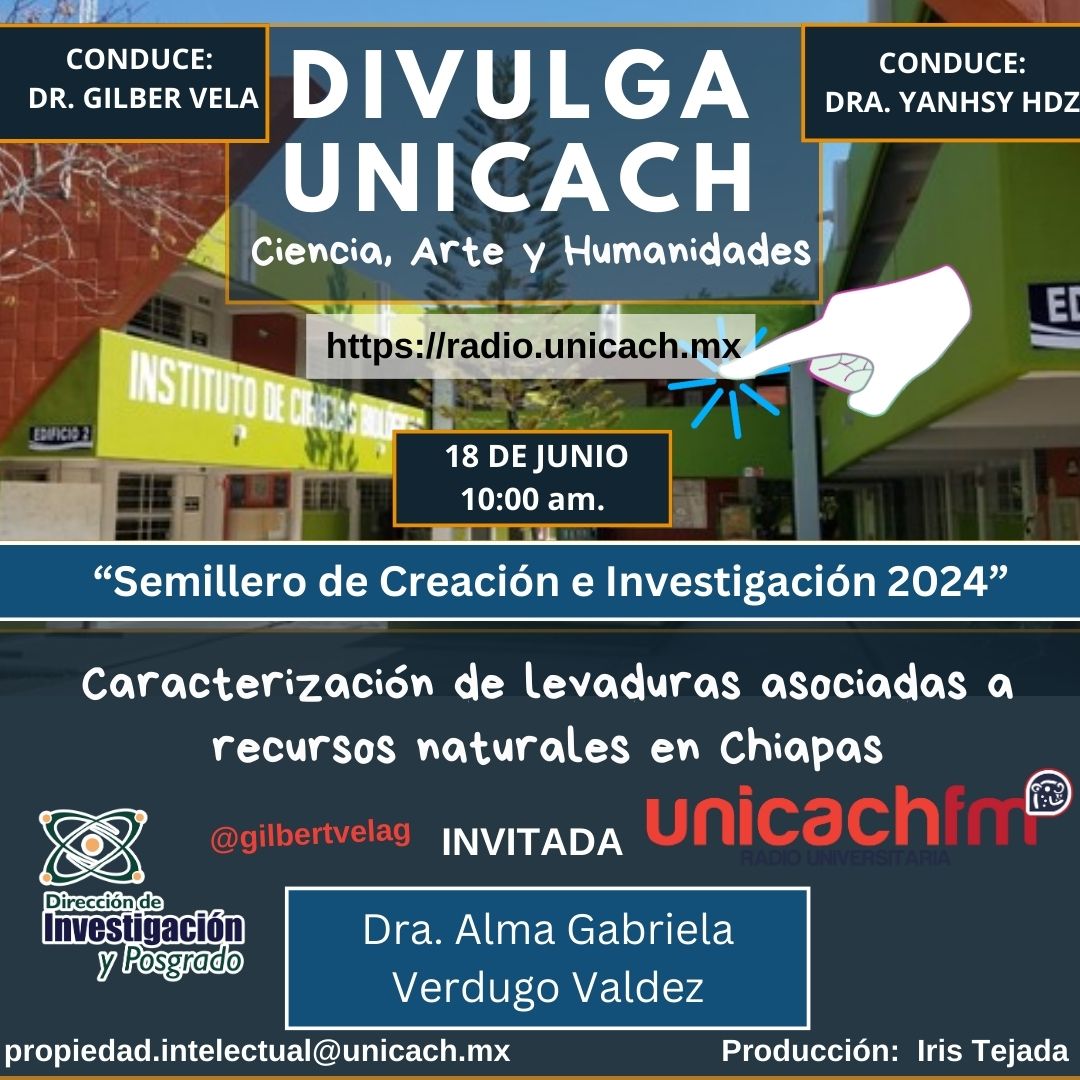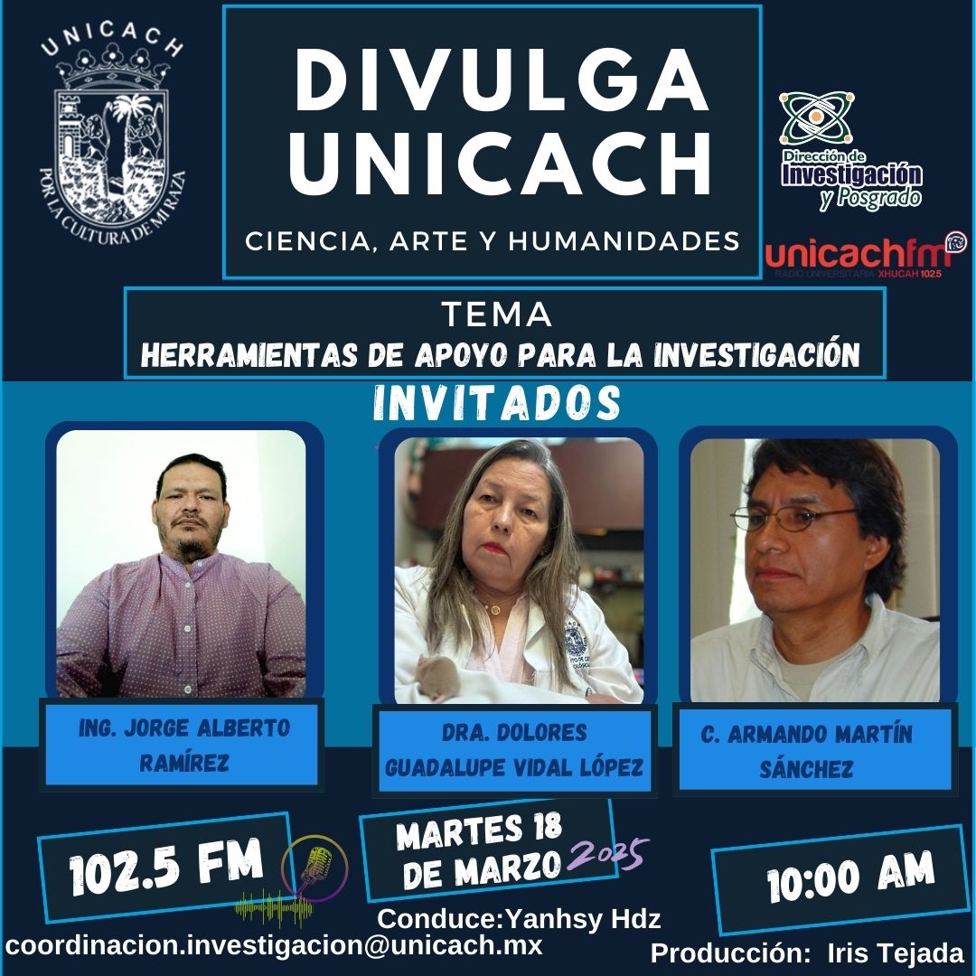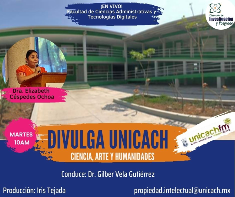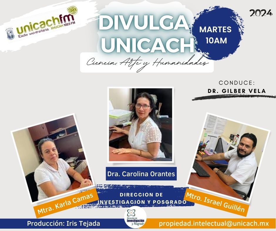 La nueva programación de DIVULGA UNICACH, tiene como finalidad dar difusión al trabajo científico y tecnológico de los investigadores, mediante coberturas en vivo en los laboratorios y espacios de formación de nuestra casa de estudio, donde se entrevistará a las y los investigadores encargados de estas áreas, tendremos la oportunidad de platicar sobre las actividades de investigación, creación e innovación que realizan acompañados de los estudiantes en formación, así como, el propósito del laboratorio y el equipamiento con el que cuenta para brindar el servicio a la comunidad universitaria. Además, nos comentarán sobre las actividades que realizan con personal externo a nuestra universidad.