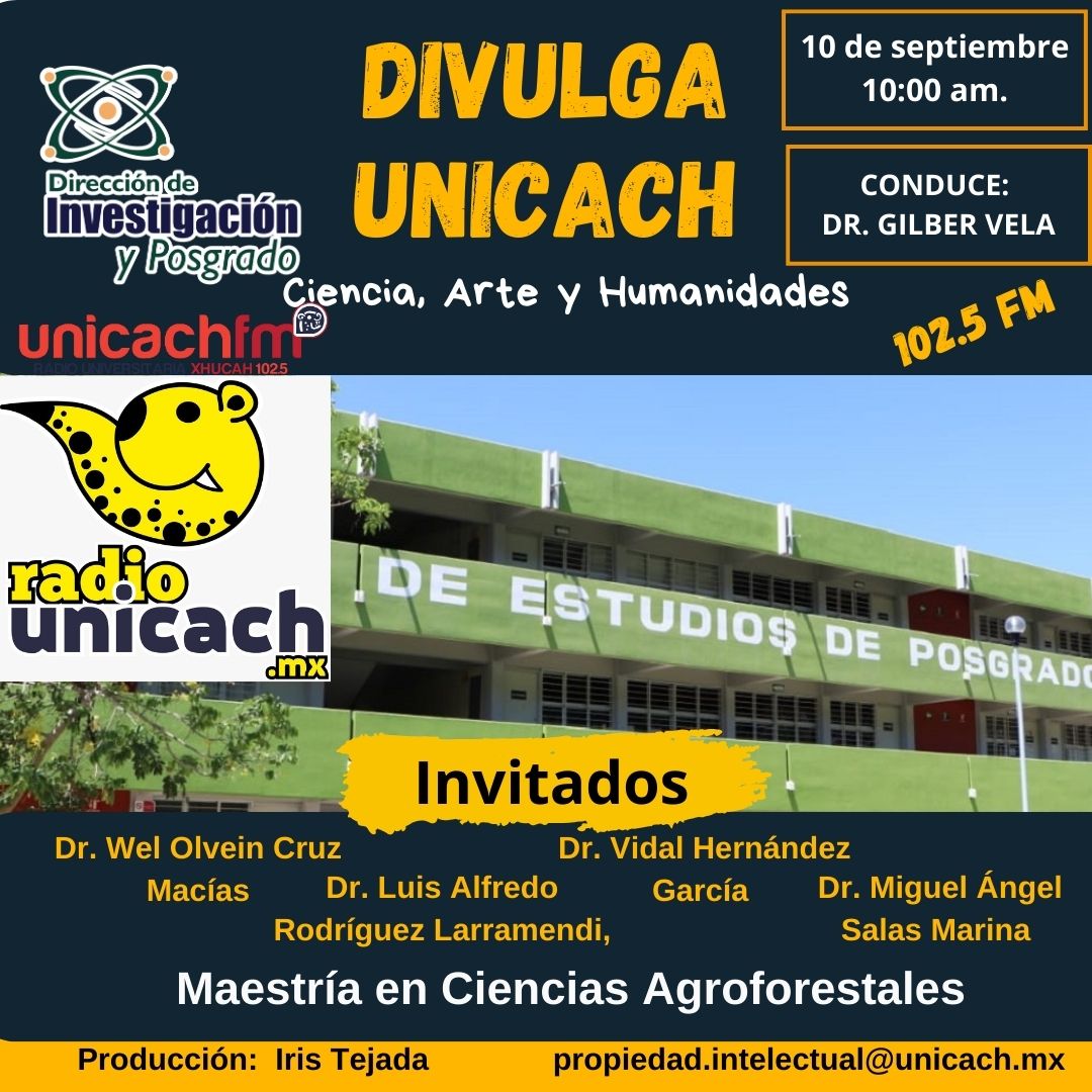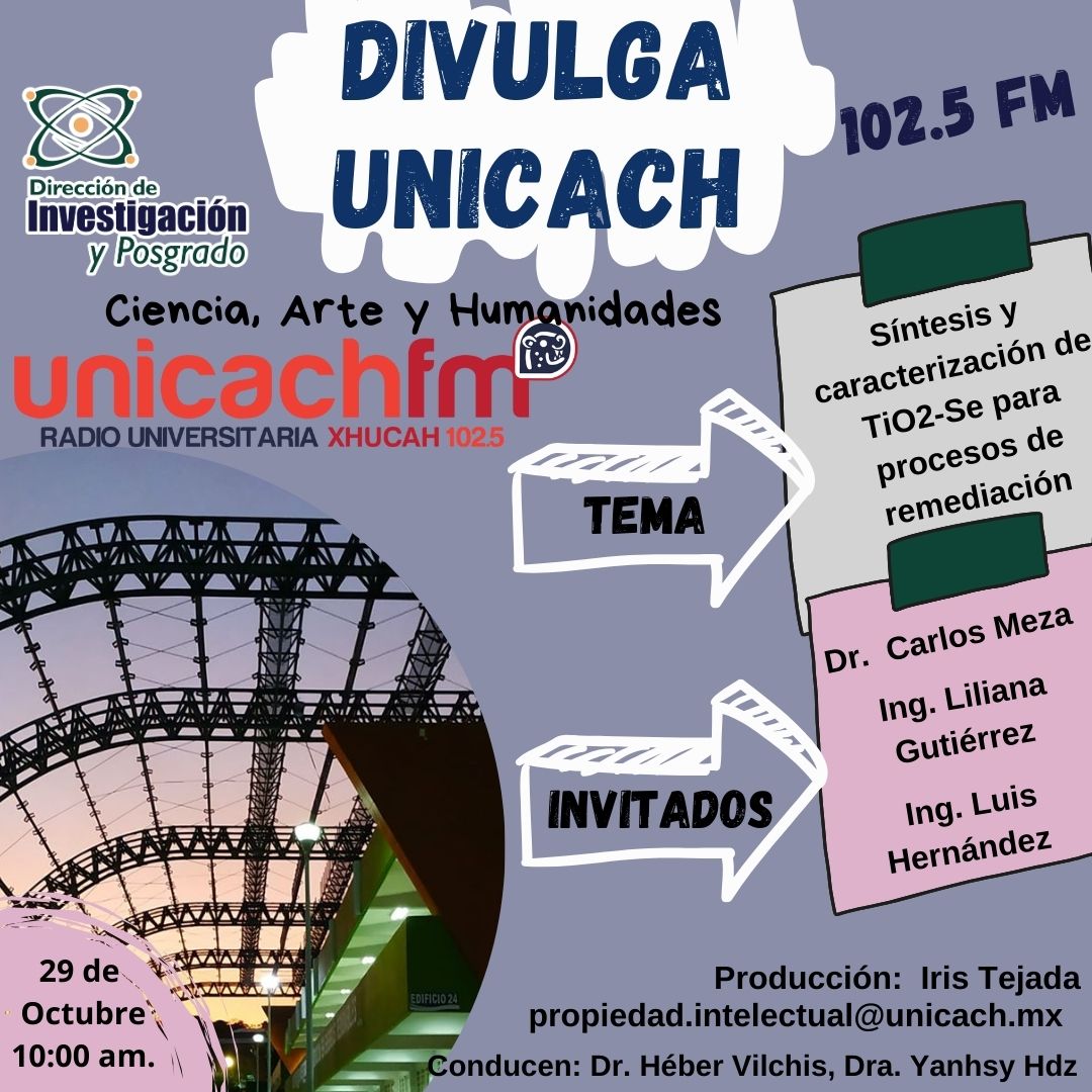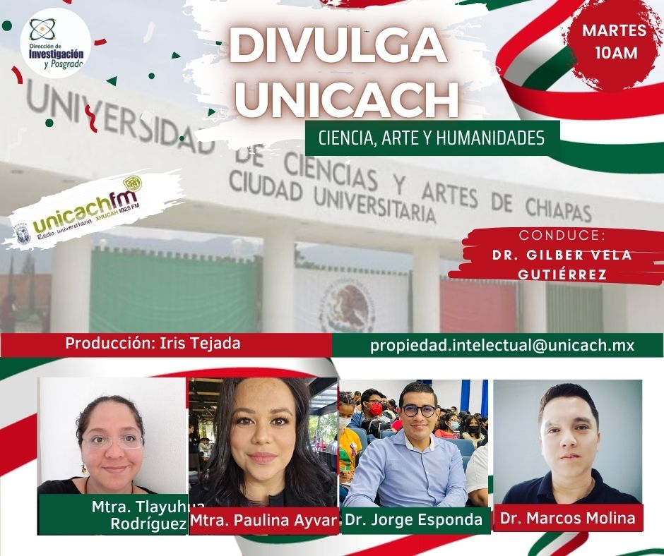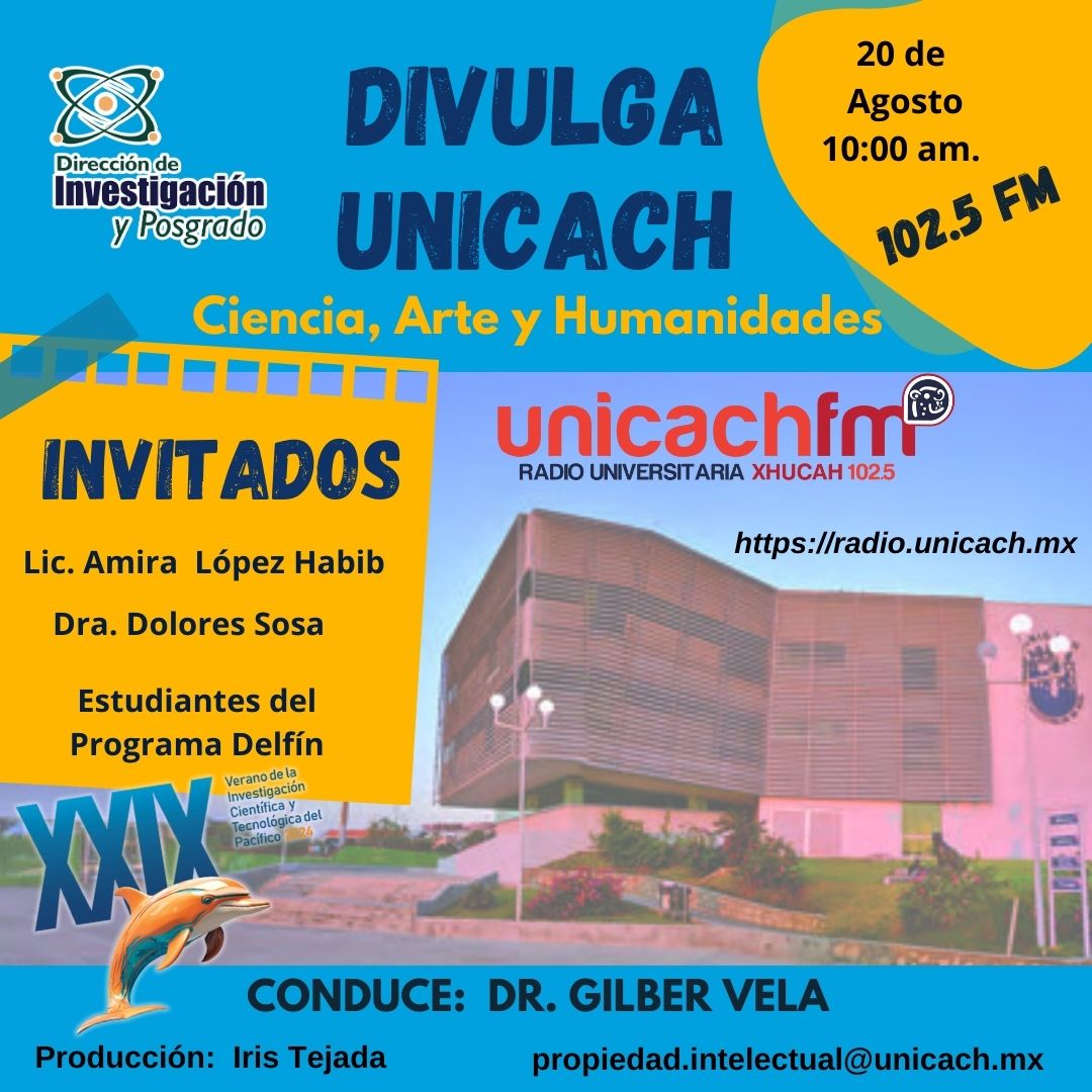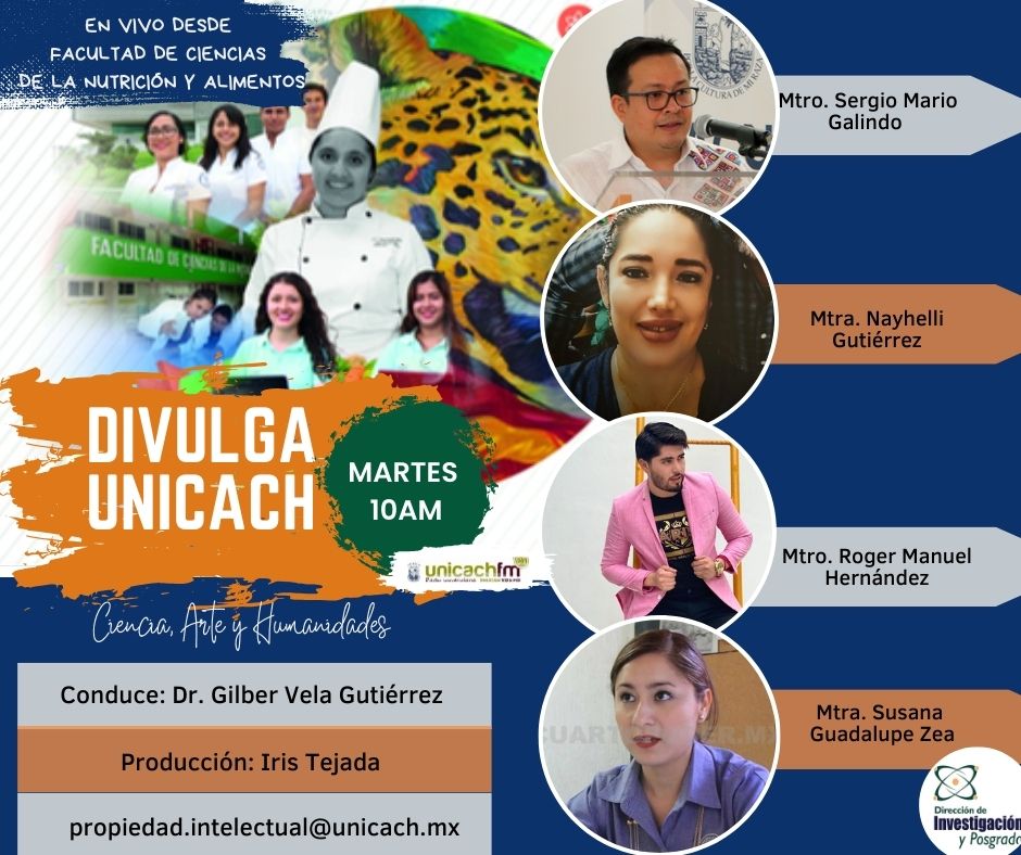 La nueva programación de DIVULGA UNICACH, tiene como finalidad dar difusión al trabajo científico y tecnológico de los investigadores, mediante coberturas en vivo en los laboratorios y espacios de formación de nuestra casa de estudio, donde se entrevistará a las y los investigadores encargados de estas áreas, tendremos la oportunidad de platicar sobre las actividades de investigación, creación e innovación que realizan acompañados de los estudiantes en formación, así como, el propósito del laboratorio y el equipamiento con el que cuenta para brindar el servicio a la comunidad universitaria. Además, nos comentarán sobre las actividades que realizan con personal externo a nuestra universidad.
