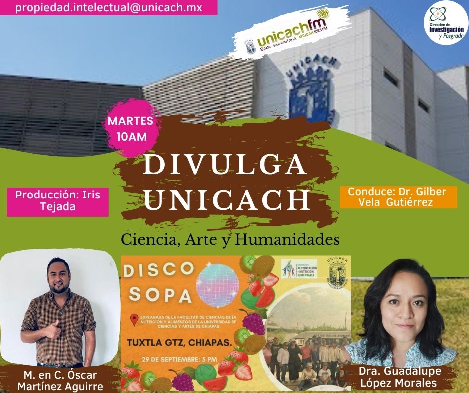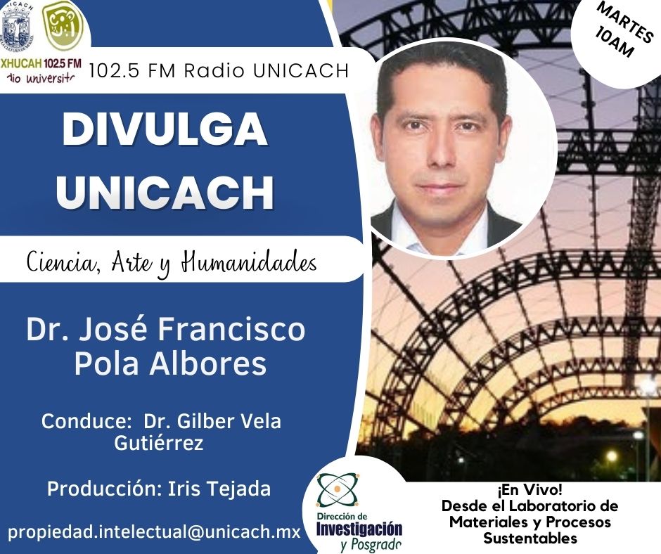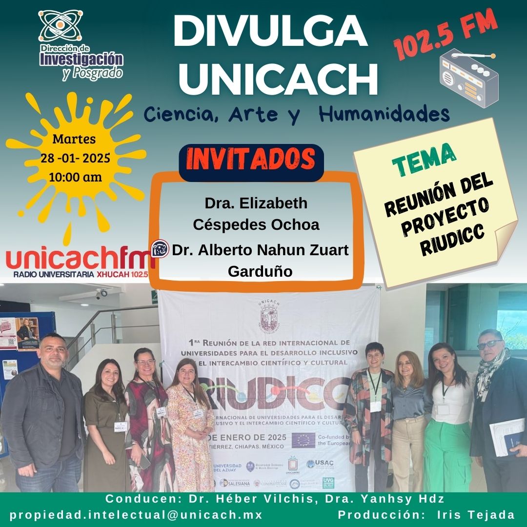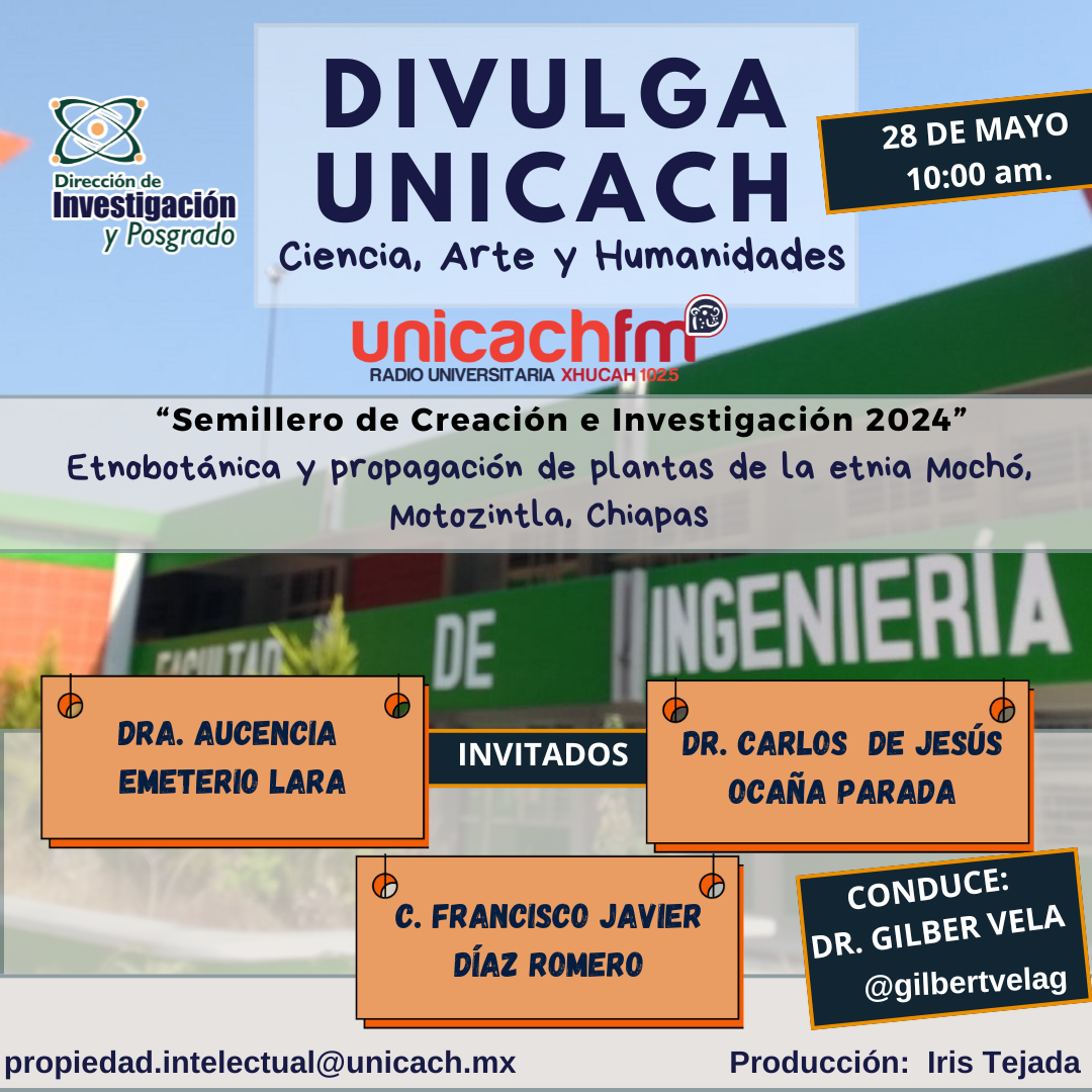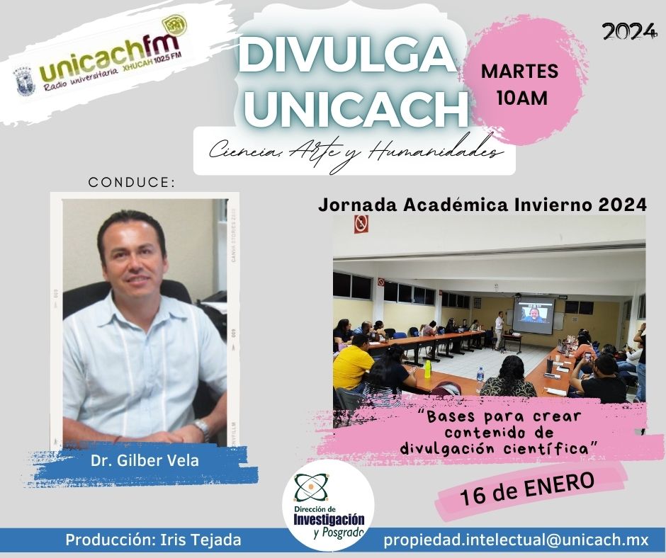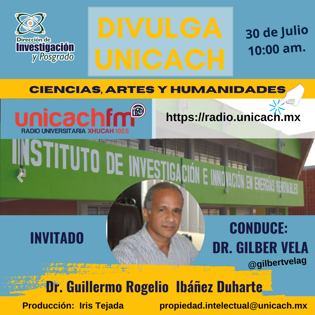 La nueva programación de DIVULGA UNICACH, tiene como finalidad dar difusión al trabajo científico y tecnológico de los investigadores, mediante coberturas en vivo en los laboratorios y espacios de formación de nuestra casa de estudio, donde se entrevistará a las y los investigadores encargados de estas áreas, tendremos la oportunidad de platicar sobre las actividades de investigación, creación e innovación que realizan acompañados de los estudiantes en formación, así como, el propósito del laboratorio y el equipamiento con el que cuenta para brindar el servicio a la comunidad universitaria. Además, nos comentarán sobre las actividades que realizan con personal externo a nuestra universidad.